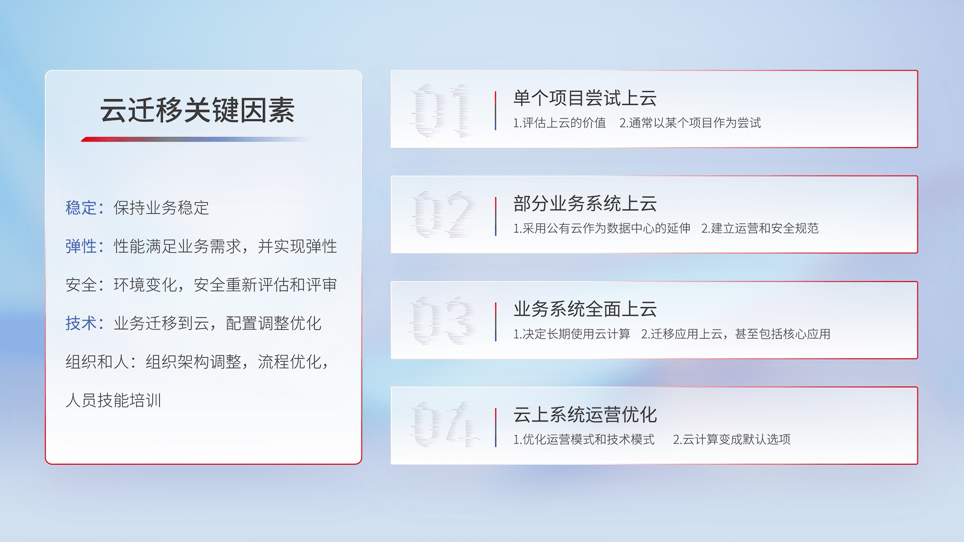结合实际业务,,,,从规划设计、、、、云平台选型、、、、云原生改造、、数据迁移、、、集成交付,,迁移全过程为客户识别最佳上云路径,,做好风险识别管理,,,设计网络架构、、、身份权限、、、、安全审计合规、、操作审计、、日志审计、、监控告警策略、、、、多站点容灾设计等,,对云上基础设施进行整体规划,,,,提升IT治理水平,,以满足弹性、、高可用、、高性能的需求。。