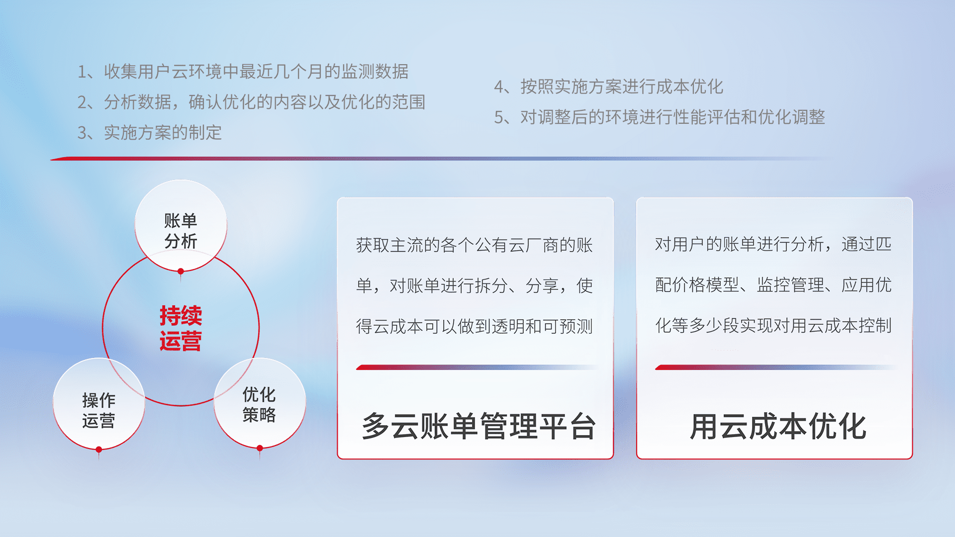通过多云纳管,,以统一的资源数据模型把客户的云资源进行抽象和封装,,,进而实现对多云资源的统一操作,,,保障云资源管理的可靠性、、、稳定性与可用性。。量身定制化运维内容,,配置、、、开发运维、、、、补丁管理、、、、备份、、、监控、、认证和访问管理、、、审计和日常巡检等,,,保障在用云过程中的可靠度,,,,稳定度以及高可用率。。。